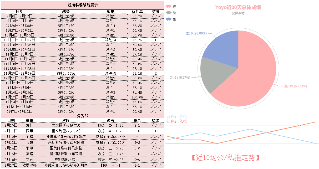 昨晚周四私推欧联杯塞维利亚3-1豪取六连胜,核心临场近8胜7,一波连胜势头持续发力!不过遗憾的是公推继续陷入连败泥潭,建议主要精力可关注私推!——而今天重点参考场次已经确认,信心依旧,获得更多粉粉的支持是Yoyo在周末继续前进的动力呀~