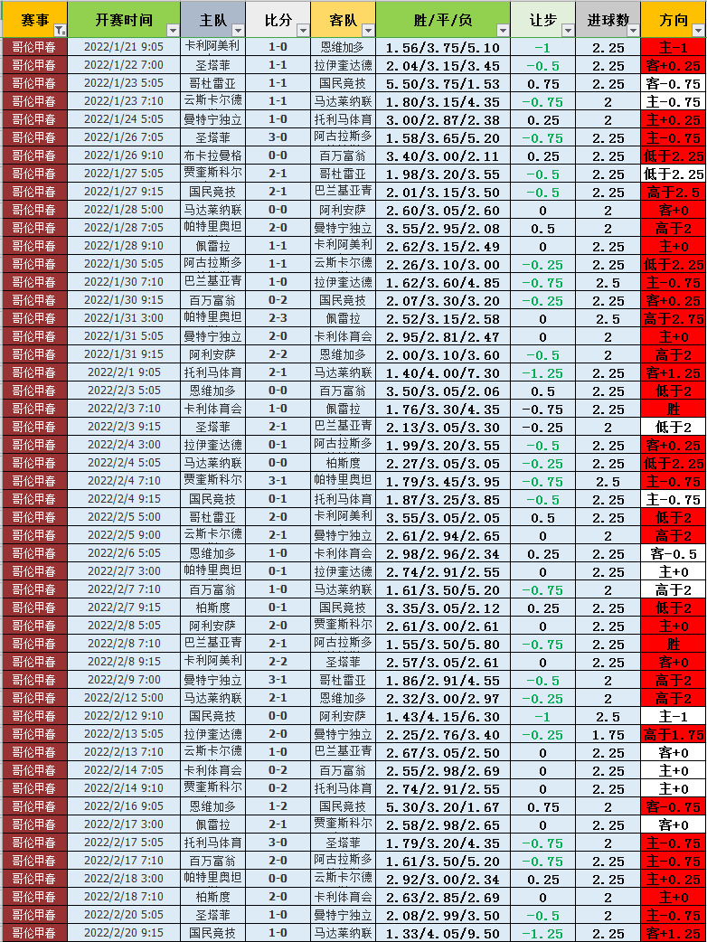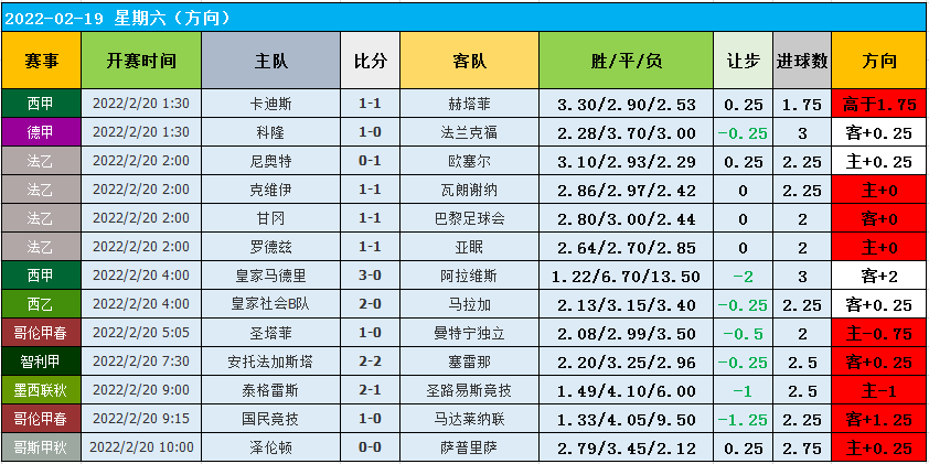 上期数据表现不错,早场除去推迟的比赛外,剩余的9场有6场顺利打出,晚场的12场有7场顺利打出,夜场的13场有9场顺利打出!上期数据中,早场的日职联表现出色,6场有5场顺利打出对应的方向,而日职乙则是表现让人失望,2场都未能打出!当然韩职也表现出色,全北现代果然不负期望打出新赛季首胜,非常的惊险!晚场的表现不错,其中英系发挥最佳,8场有6场顺利打出对应的方向,打出率高达75%!而英甲是最出色的,2场都是大获全胜拿下,非常的轻松!最无奈的便是法乙了,在让步和进球数一致的情况下,未能选中正确的方向,颇让人心痛的!夜场的表现出色,其中美洲赛事表现最强,5场全部打出,而且基本都是大获全胜打出的,非常的强势,也继续维持了高胜率联赛的特色!而法乙的表现也是非常亮眼的,4场有3场是打出对应的高概率方向的,非常的不错!近期英冠的表现出色,近42胜31,打出率高达74%!哥伦甲新赛季的表现是非常不错的,近50胜37,打出率高达74%!希腊超近19胜12,打出率高达63%!法乙近27胜20,打出率高达74%!哥斯甲近16胜12,打出率高达75%,非常的稳健!今天的比赛较多,笔者挑选了部分夜场比赛出来作为本期的参考,希望能够打出对应的高概率方向!