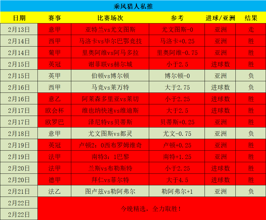私推近期9胜7,整体状态出色!昨私推未能拿下,今晚焦点欧冠+英冠等赛事来战,今晚精选2场信心赛事,全力再出击,继续吃肉,兄弟们抓紧一起冲!