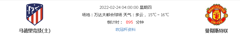 北京时间2022年2月24日04:00, 2021-2022 欧洲联赛冠军杯赛,马德里竞技vs曼彻斯特联,此役是欧冠十六强赛首回合的较量,客队曼彻斯特联上轮联赛客场4-2大胜利兹联,各项赛事近9场取得5胜4平不败战绩,主队马德里竞技上轮联赛客场3-0零封奥萨苏纳,近期联赛状态起伏不定,此役坐镇主场万达大都会球场迎战曼彻斯特联,两队如何对峙?下面由本作者为大家做详细阐述。
