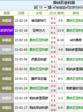 北单编号76 奥林匹亚科斯vs亚特兰大