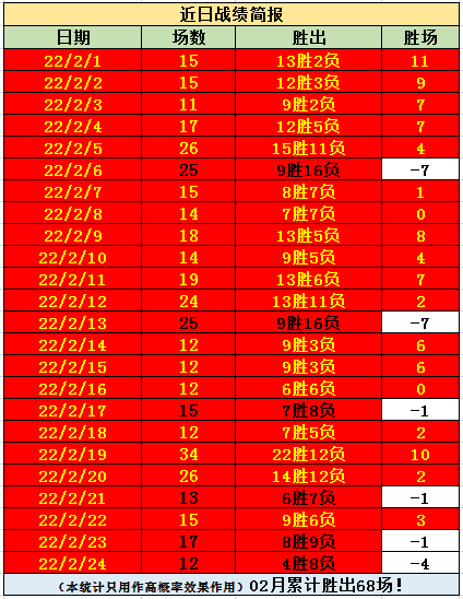 上期数据表现不佳,晚场的5场只有1场顺利打出,夜场的7场有3场顺利打出!上期数据中,晚场的欧罗巴杯表现较差,3场皆墨,未能打出对应的方向,非常的无奈!而欧会杯则是一胜一负表现平稳!夜场的表现比较极端,巴西杯和欧罗巴杯都是一胜一负,未能达到理想效果!而自由杯也是在下半场接连失守,最终未能挽回局面,最终保持100%胜率的记录被打破,比较可惜!不过比较好的是墨西联这场是大胜拿下的,比较还是比较可以的!近期英冠的表现出色,近46胜32,打出率高达70%!哥伦甲新赛季的表现是非常不错的,近55胜41,打出率高达74%!希腊超近19胜12,打出率高达63%!法乙近27胜20,打出率高达74%!哥斯甲近18胜14,打出率高达78%,非常的稳健!今天的比赛较多,笔者挑选了部分夜场比赛出来作为本期的参考,希望能够打出对应的高概率方向!