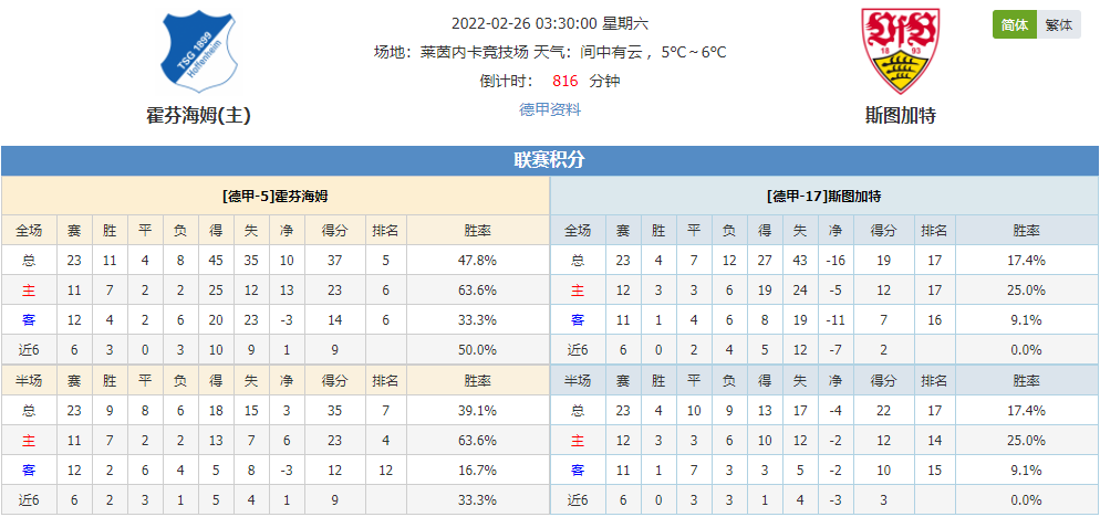联赛战绩:霍芬海姆23战取得11胜4平8负的成绩,排名联赛第5,进45球,失35球。斯图加特23战取得4胜7平12负的成绩,排名联赛第17,进27球,失43球。