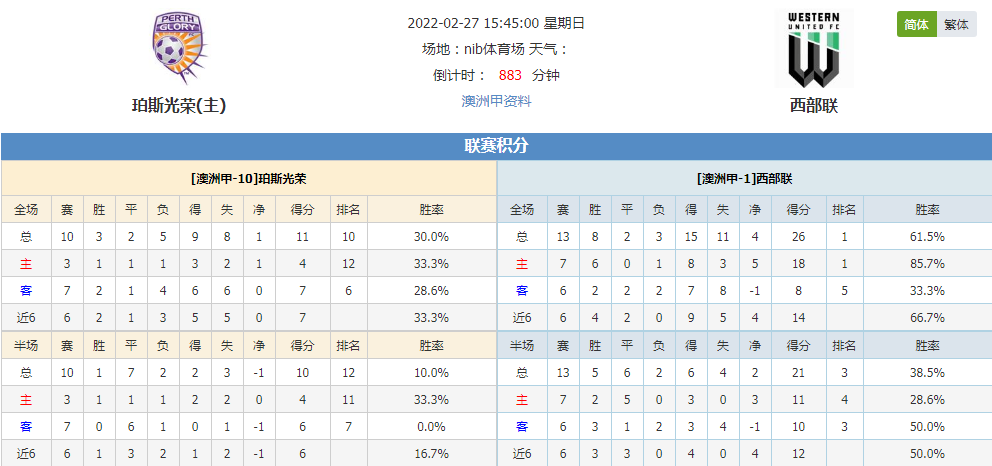 珀斯光荣本赛季澳洲甲成绩3胜2平5负,积分11,排名第1-;西部联本赛季澳洲甲成绩8胜2平3负,积分26,排名第1