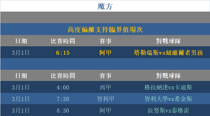 利用「魔方關系」進行支持趨勢預測分析(所有數據均結合中國競彩(主)、亞歐數據作為分析體系),超越臨界數值之上可視為低機率方向,此方式對比賽方向分析有顯著幫助效果。