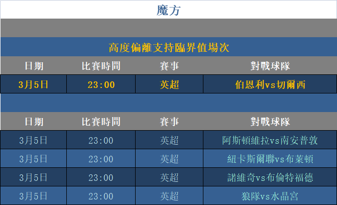 利用「魔方關系」進行支持趨勢預測分析(所有數據均結合中國競彩(主)、亞歐數據作為分析體系),超越臨界數值之上可視為低機率方向,此方式對比賽方向分析有顯著幫助效果。
