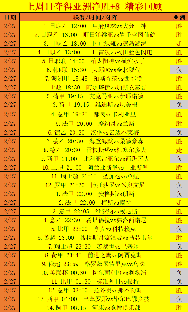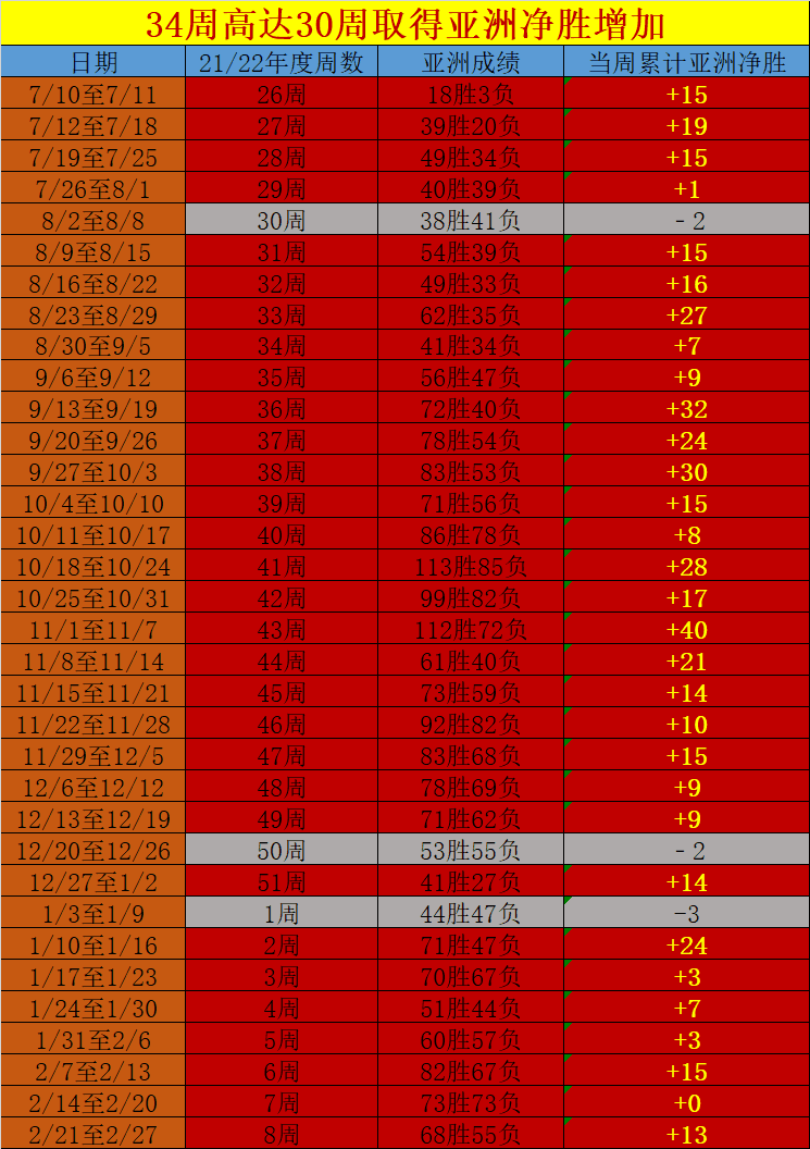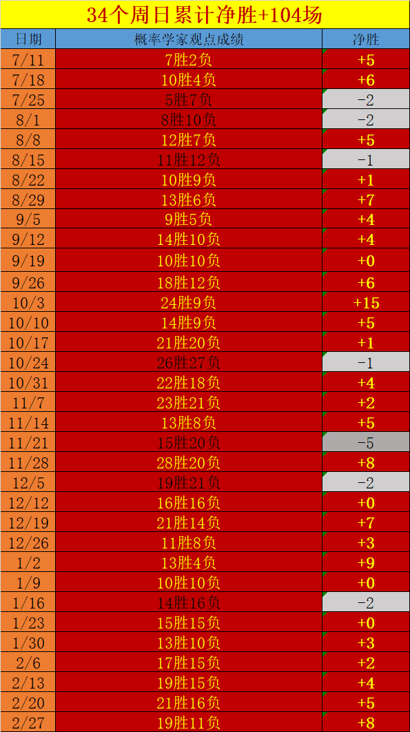 (三)成绩回顾:昨天成绩表现精彩,CDA数据模型修复能力及其顽强再次展示。今天周日,全周成绩冲刺阶段,上周日拿下亚洲净胜+8,CDA数据模型已经连续5个周日以亚洲净胜增长成绩呈现,近5个周日累计亚洲净胜+22场,近期周日成绩表现相当精彩。整体成绩提取出来34个周日成绩,周日整体亚洲净胜累计+104场,平均每个周日能取得亚洲净胜+3.06场。周日近期表现抢眼夺目,周日成绩为CDA数据模型贡献巨大,周日的成绩冲刺阶段更值得大家期待。一场比赛信息面波谲云诡,外界利用信息面的不对称,达到他们所希望的目的,我们唯一能做的不是寻找更多信息面,而是通过数据面的复杂计算,了解他们的目的,做到知己知彼、百战不殆。