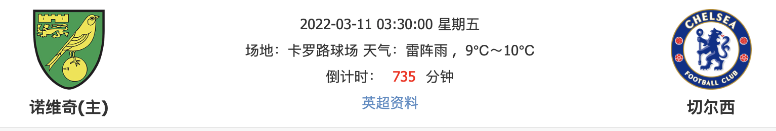诺维奇本赛季以4胜5平18负,积分17,联赛积分排名第20;切尔西本赛季以15胜8平3负,积分53,联赛积分排名第3