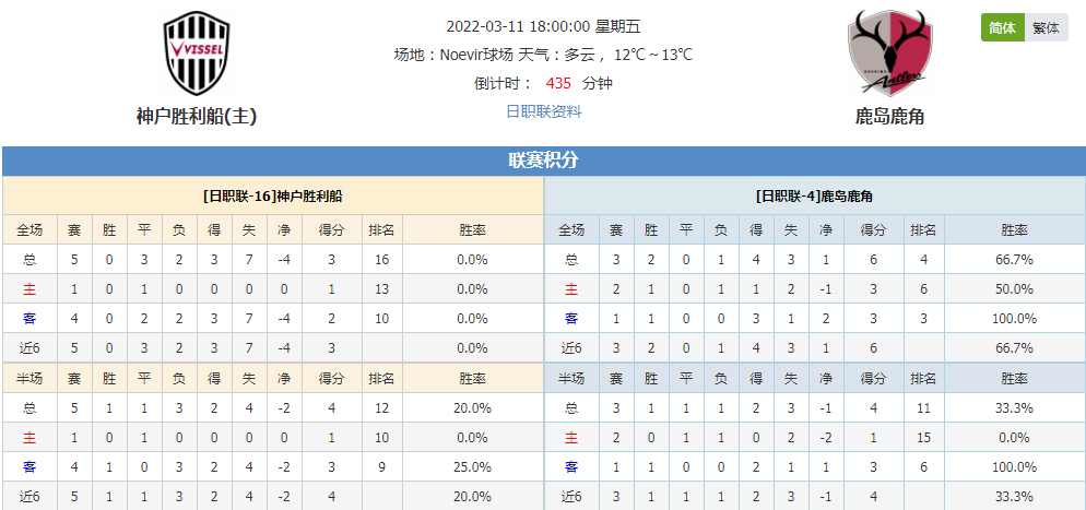 北京时间03月11日18:00,日职联第四轮赛事神户胜利船vs鹿岛鹿角,神户胜利船联赛一胜难求,他们今仗坐镇主场能否捍卫主场?鹿岛鹿角上仗战胜,终结了连败的尴尬,此番客场走访是否已做好准备?