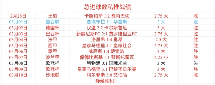 周四私推总进球数1场稳稳胜利,总进球数近10胜9,非常稳健!亚洲数据昨晚休息无私推,经过几天的休息调整总结分析,状态有所复苏,今晚会重新开始私推,全胜节奏搞起来!鸡锅私推会持续保持精挑细选原则,在精不在多,必须全胜起飞!