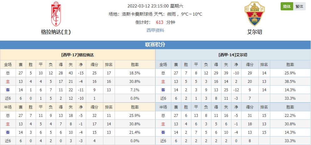 北京时间2022年3月12日23:15,西甲联赛第28场赛事,格拉纳达将坐镇主场迎战艾尔切, 格拉纳达近期多场赛事不胜,状态低迷,艾尔切最近遭遇2连败,状态欠佳,那么状态都不佳的两队对峙,会擦出怎样的火花?