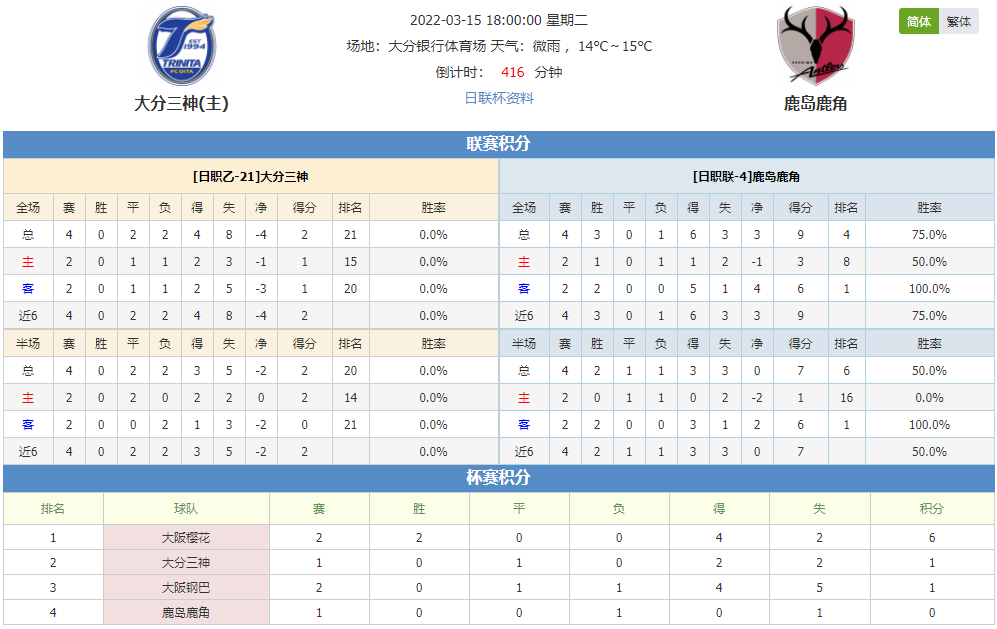 北京时间3月15日18:00,日联杯小组赛,大分三神主场对战鹿岛鹿角,大分三神最近多场赛事不胜,状态不佳,鹿岛鹿角最近斩获2连胜,状态正佳,那么本场是大分三神终结颓势,重回胜轨?还是鹿岛鹿角延续胜绩?