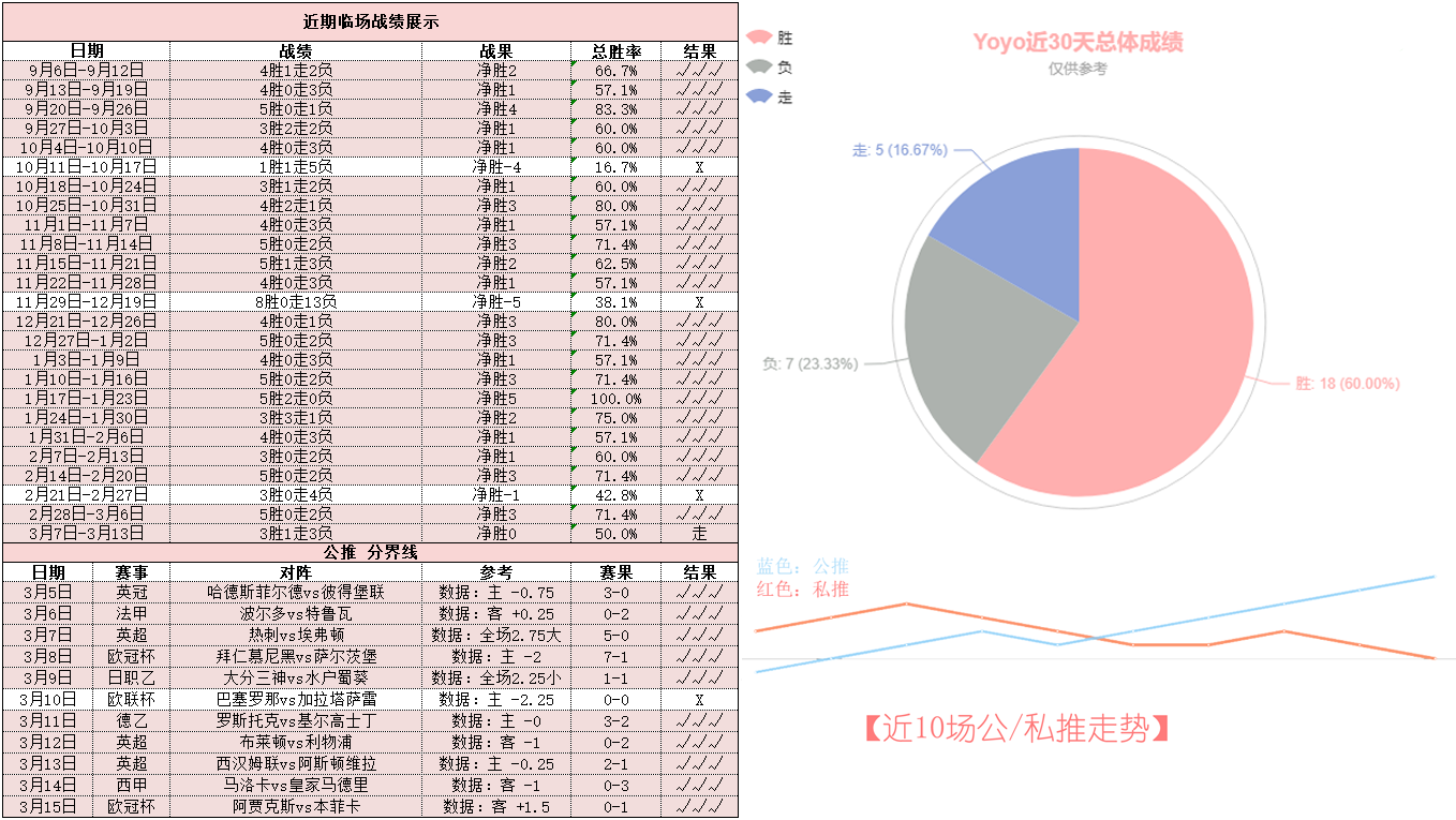 昨晚周一私推土超未能成功打出十分可惜,近期核心临场有所波动!不过公推西甲皇马3-0稳稳拿下,竞彩、亚洲数据双双打出实现四连胜!——公推+私推实现有效增长,今天重点参考场次已经确认,信心依旧,新的一周继续追随Yoyo的步伐前进呀~