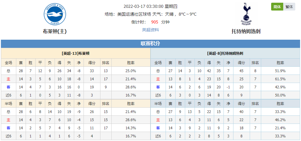 北京时间2022年3月17日03:30,英超迎来第29轮赛事,布莱顿主场对战托特纳姆热刺,布莱顿近期遭遇5连败,本轮能否全身而退?托特纳姆热刺上轮客场遭遇失利,本轮客场还能否有作为?