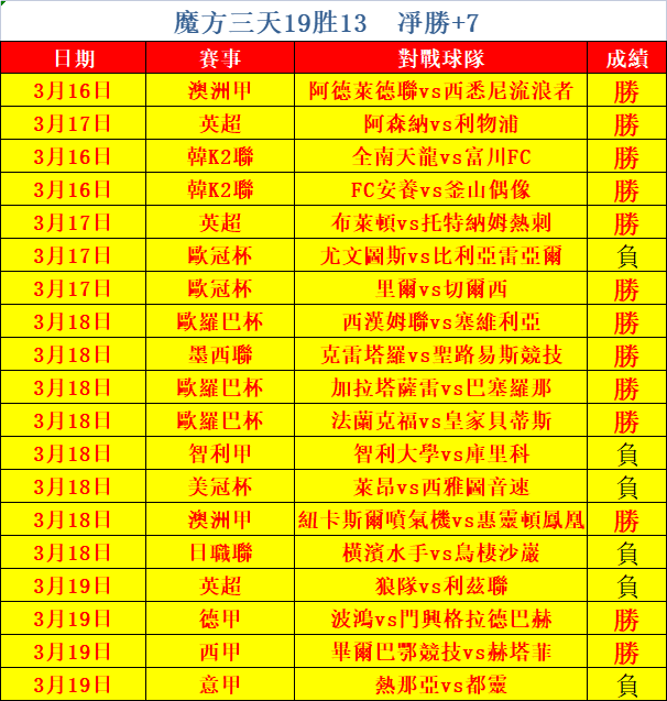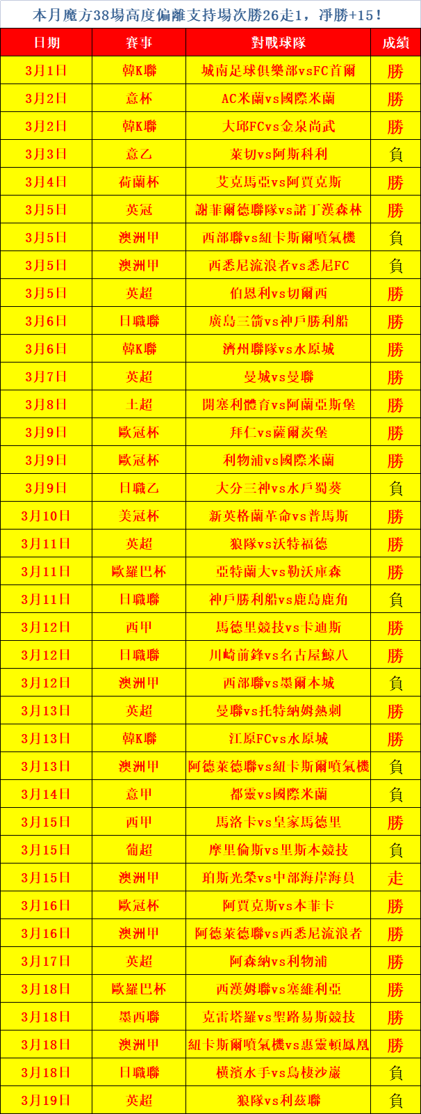 近三天成績16勝13,凈勝+7!高度偏離支持臨界值場次狀態持續穩定,取得本月高度偏離支持臨界值場次近38場勝26走1,凈勝+15的佳績!魔方將繼續努力,追求精益求精。
