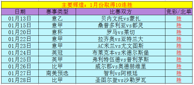主要辉煌战绩:1月份取得10连胜