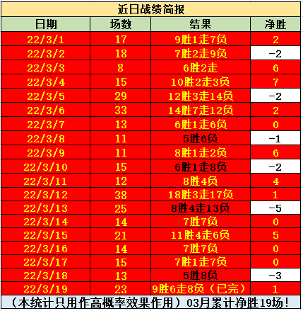 上期数据表现出色,早场的9场有6场顺利打出,晚场的4场有9场顺利打出!上期数据中,早场的日职乙表现不错,4场有3场顺利打出,而日职联5场打出3场表现也是比较满意的!晚场的表现不错,其中意乙和西甲的表现是最佳的,3场全部打出对应的高概率方向,非常的稳健!而英冠和英甲继续保持高效结果,7场有5场顺利打出对应的方向,尤其是英甲,2场胜利都是在90分钟制定的,非常的惊险!近期英冠的表现出色,近69胜44,打出率高达64%!哥伦甲新赛季的表现是非常不错的,近75胜56,打出率高达75%!希腊超近20胜12,打出率高达60%!法乙近49胜32,打出率高达65%!哥斯甲近28胜19,打出率高达68%,非常的稳健!自由杯近18胜13,打出率高达72%,非常可观!日职联新赛季近31胜22,打出率高达71%!今天的比赛较多,笔者挑选了部分早场比赛出来作为本期的参考,希望能够打出对应的高概率方向!