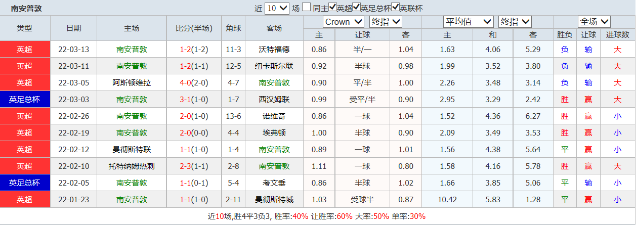 南安普顿作为英超中游球队,球队整体的实力有限,球队本赛季的联赛赛事取得8胜11平10负的成绩,目前排名第10。球队近期整体表现较差,上场比赛主场面对沃特福德,球队虽在场面上略占上风,但比赛上半场开局不久便丢了2球,好在上半场末端追回来1球,之后的很长时间内南安普顿都未有再进球,最终以1-2的比分失利。