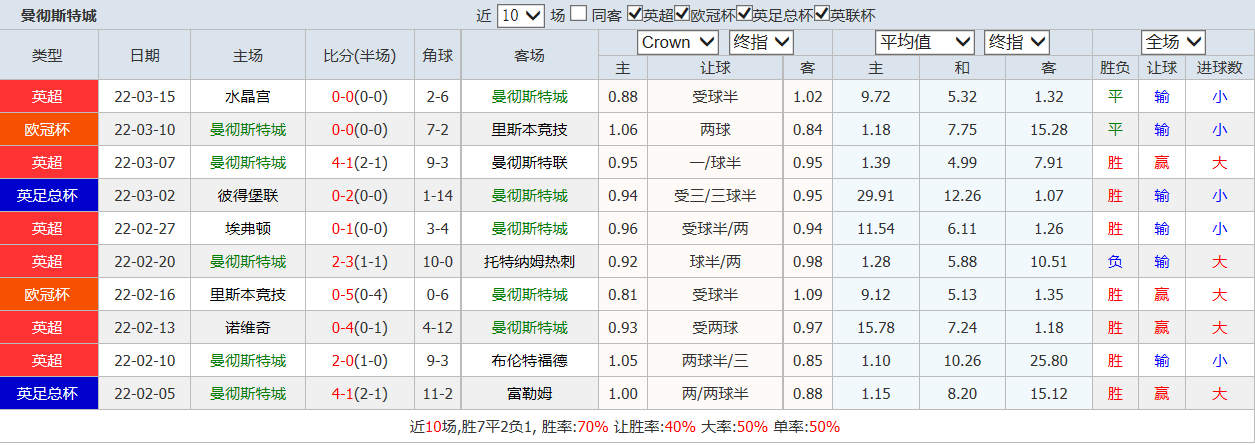 曼城作为英超的豪门球队,本赛季联赛赛事取得22胜4平3负的成绩,目前排名第1。球队近期整体表现出色,目前近来进球能力有下滑,上场比赛面对水晶宫,曼城在场面上优势巨大,控球率达到七成以上,但遗憾都未能进球,最终以0-0的比分与对手战平。