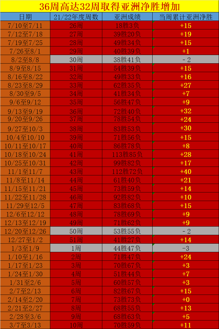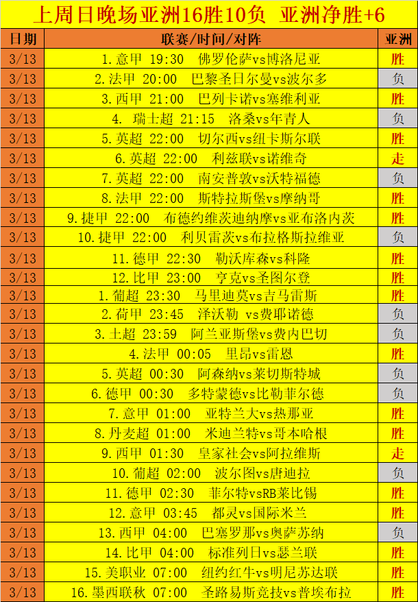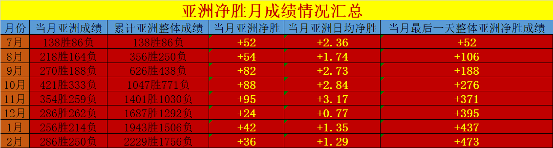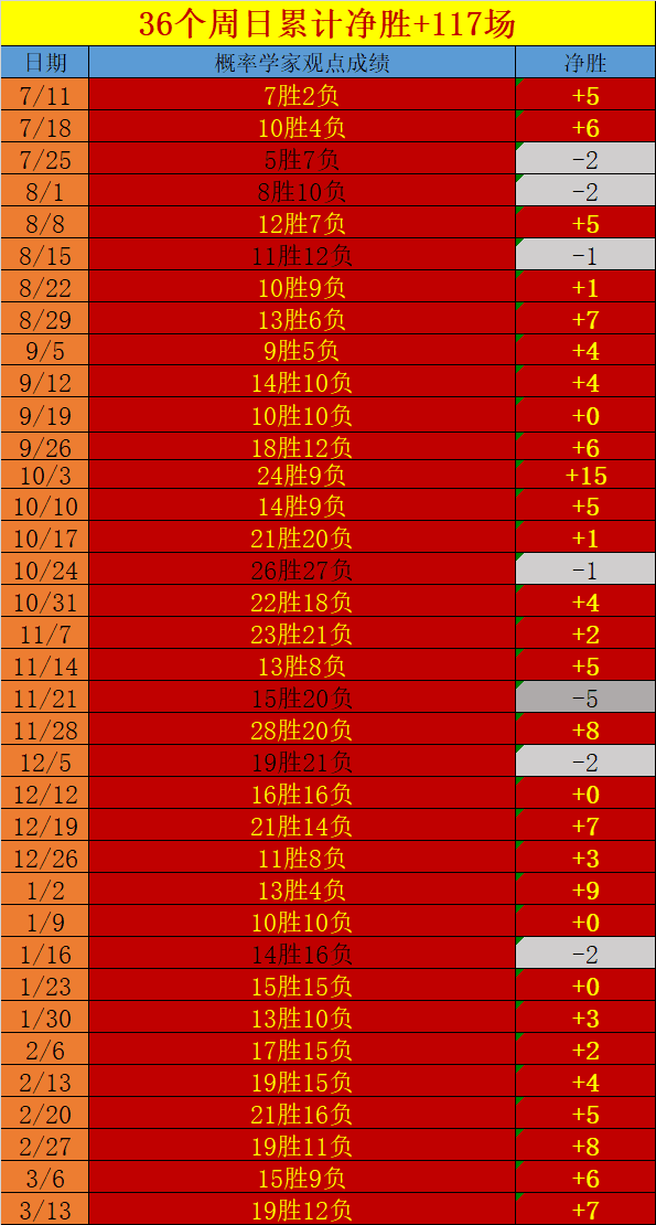 (三)成绩回顾:昨天成绩遗憾没有以亚洲净胜增长呈现。今天周日,上周日晚场取得亚洲16胜10负成绩,上周日晚场取得亚洲净胜+6,为今天周日晚场成绩冲刺增添信心。另外整体成绩36个周日,累计拿下亚洲净胜+117场,平均周日亚洲净胜高达+3.25场,周日的成绩贡献值得认可,周日信心更胜一筹。一场比赛信息面波谲云诡,外界利用信息面的不对称,达到他们所希望的目的,我们唯一能做的不是寻找更多信息面,而是通过数据面的复杂计算,了解他们的目的,做到知己知彼、百战不殆。