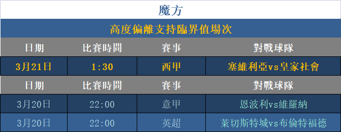 利用「魔方關系」進行支持趨勢預測分析(所有數據均結合中國競彩(主)、亞歐數據作為分析體系),超越臨界數值之上可視為低機率方向,此方式對比賽方向分析有顯著幫助效果。