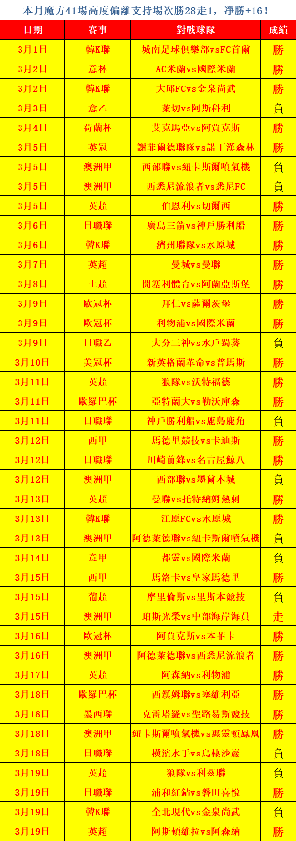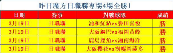 昨天日職聯專場4場全勝。近三天成績16勝13,凈勝+7!高度偏離支持臨界值場次狀態持續穩定,取得本月高度偏離支持臨界值場次近41場勝28走1,凈勝+16的佳績!魔方將繼續努力,追求精益求精。