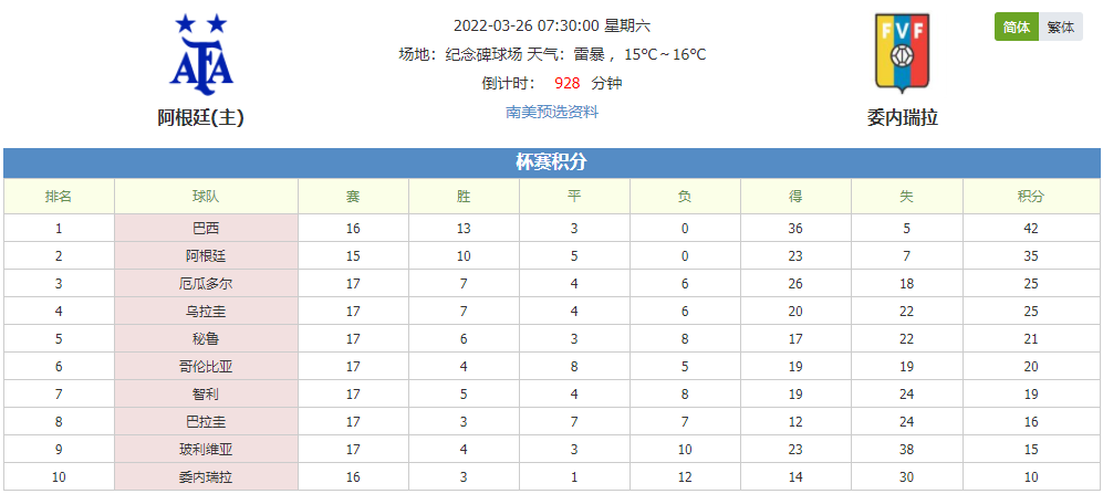 杯赛战绩:阿根廷15战取得10胜5平0负的成绩,排名小组第2,进23球,失7球。委内瑞拉16战取得3胜1平12负的成绩,排名小组第10,进14球,失30球。