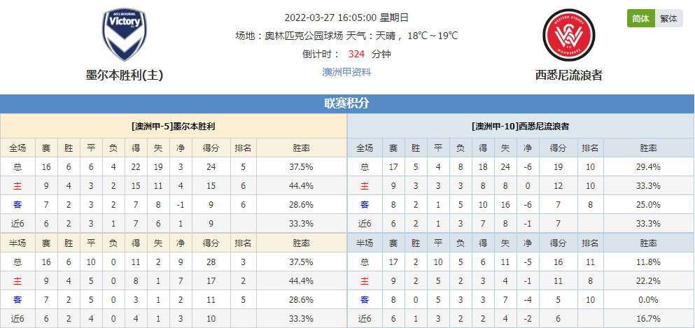 北京时间03月27日16:05,澳洲甲第二十轮赛事墨尔本胜利vs西悉尼流浪者,墨尔本胜利遭遇四连平处境尴尬,他们今仗坐镇主场能否取回胜绩?西悉尼流浪者上仗战平,延续球队的不败之势,此番客场走访是否已做好准备?