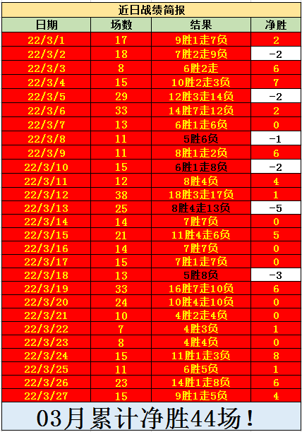 昨天数据表现出色,早场的4场有2场顺利打出,晚场的6场有3场顺利打出,夜场的5场全部打出,拿下大满贯的出色表现!昨天数据中,早场的韩K2联表现出色,2场都顺利拿下,而澳洲甲则是在主队90分钟送出点球的情况下被灭掉,颇为可惜!晚场的表现一般,其中荷乙和以甲的表现出色,2场都顺利拿下,非常的不错!夜场的表现惊人,其中智甲和巴圣锦标2场都是大获全胜拿下的,非常的不错!当然哥伦甲继续有惊人表现,3场全部打出,再次为净胜立下大功!