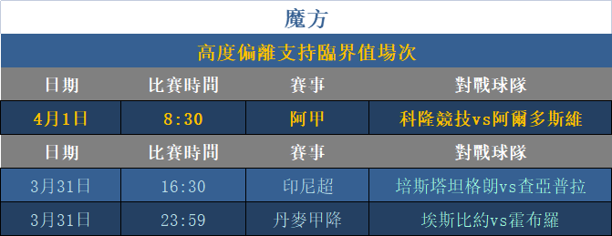 利用「魔方關系」進行支持趨勢預測分析(所有數據均結合中國競彩(主)、亞歐數據作為分析體系),超越臨界數值之上可視為低機率方向,此方式對比賽方向分析有顯著幫助效果。
