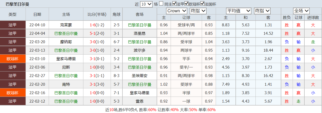 巴黎圣日尔曼作为法甲豪门球队,球队整体的阵容和实力强大,本赛季联赛成绩依旧优异,赛事取得22胜5平4负的成绩,目前排名榜首。球队近期状态尚好,尤其主场表现稳定,上场联赛客场对战克莱蒙,球队场面上占据绝对优势,上半场开局便领先两球,虽在上半场末段丢掉了1球,但比赛下半场球队火力全开,连进4球,最终以6-1的大比分拿下胜绩。