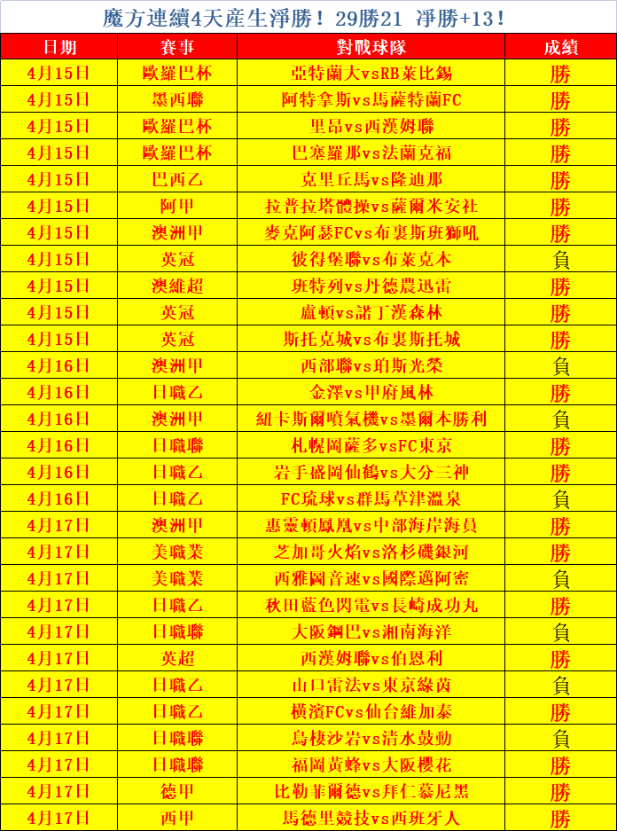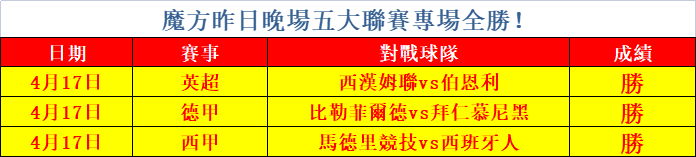 魔方近4天連續産生淨勝,成績29勝21,淨勝+13,狀態十足!昨日賽事中,晚場五大聯賽專場表現出色,斬獲3場全勝!魔方將繼續努力,追求精益求精。
