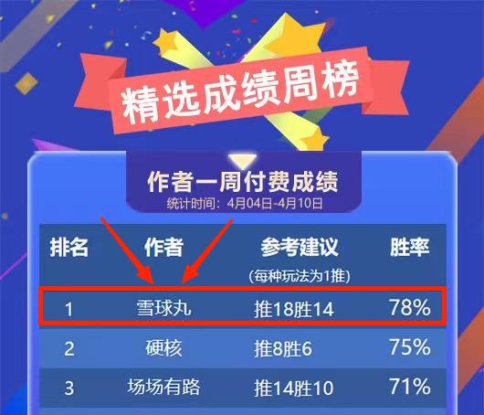 上周精选成绩周榜排名第一,精选参考推18胜14(日期:4月4日-4月10日)