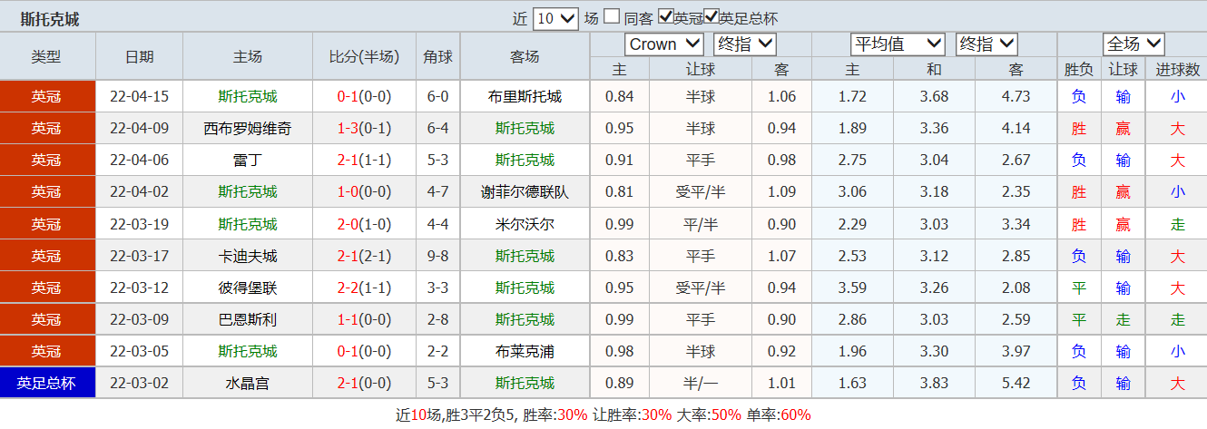斯托克城作为英冠中下游球队,球队整体的实力相对要逊色一些,本赛季联赛赛事取得15胜10平17负的成绩,成绩排名第十五。球队近期的状态不太不稳定,上场联赛主场面对布里斯托城,球队虽场面上占据优势,可惜全场都未实现进球,到比赛最终几分钟还丢掉1球,最终遗憾以0-1的比分告负。