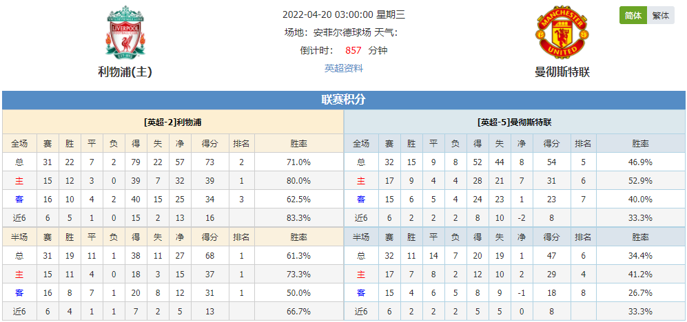 北京时间2022年04月20日03:00,英超联赛继续火热进行,此战由利物浦坐镇主场迎战曼彻斯特联,两队本赛季首回合交战,利物浦作客以5-0完胜曼彻斯特联,过去2次交手都保持全胜,心理优势明显,此番回到主场,利物浦能否再次大胜而归?