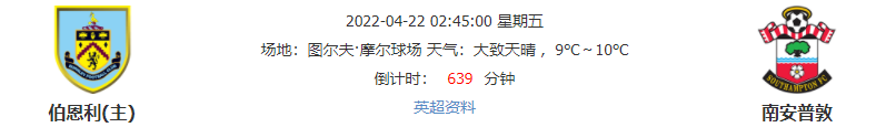 北京时间2022年04月22日02时45分,英超的一场焦点比赛,伯恩利主场对战南安普敦,伯恩利上轮联赛客场战平西汉姆联,本轮主场能否有作为?南安普敦上轮联赛主场取得胜利,本轮客场能否延续胜绩?我们拭目以待。