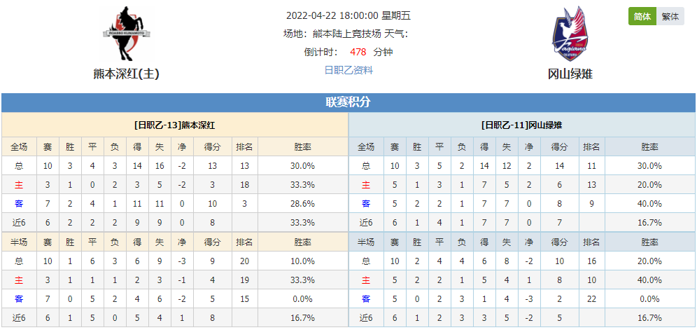 北京时间2022年04月22日18:00,日职乙联赛继续火热进行,本场比赛由升班马熊本深红坐镇主场迎战冈山绿雉,熊本深红过去10次面对冈山绿雉都未曾有过胜绩,此番再战,熊本深红能否打破过去交战不胜的僵局?