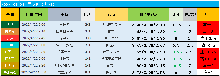 今天的比赛较多,笔者挑选了部分夜场比赛出来作为本期的参考,希望能够打出对应的高概率方向!