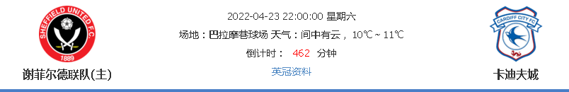 北京时间2022年4月23日22:00, 2021-2022 英格兰冠军联赛,谢菲尔德联队vs卡迪夫城,此役是英冠联赛第44轮的较量,客队卡迪夫城上轮联赛主场0-1不敌卢顿,联赛2轮连败,主队谢菲尔德联队上轮联赛客场1-1战平布里斯托城,联赛3轮不胜,此役坐镇主场巴拉摩巷球场迎战卡迪夫城,两队如何对峙?下面由本作者为大家做详细阐述。