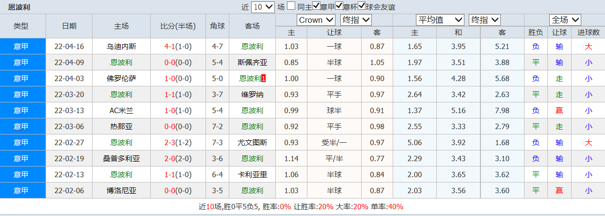 恩波利作为升班马,球队本赛季意甲联赛表现不太理想,赛事取得8胜10平15负的成绩,成绩排名第十四,总进球数为42球,失球数达到60球,球队整体的实力还是比较有限。目前连续十六场联赛不胜,上场联赛客场对战乌迪内斯,球队场面上表现积极,可惜上半场开局对手便通过点球机会取得领先,下半场开局不久再丢1球,之后虽有扳回1球,但比赛末段再连续丢掉2球,最终以1-4的比分惨败对手。
