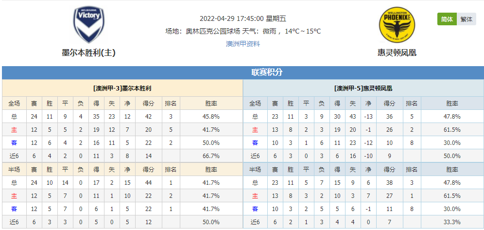 墨尔本胜利本赛季澳洲甲成绩11胜9平4负,积分42,排名第3;惠灵顿凤凰本赛季澳洲甲成绩11胜3平9负,积分36,排名第5