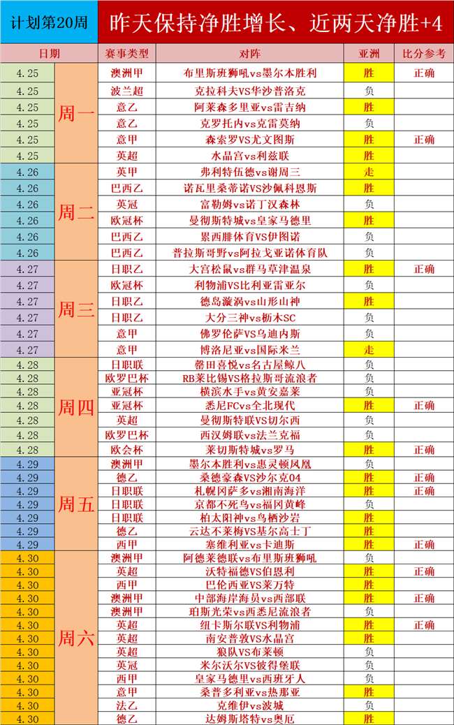 1、推演士计划第20周,昨天周六保持稳定,推13胜7,净胜+1,比分预测3场正确,昨天保持收获增长,近两天亚洲净胜+4,6场比分预测正确,今天周末最后冲刺,请记住了,要关注所以赛事和比分,《周末给你意想不到的收获》。