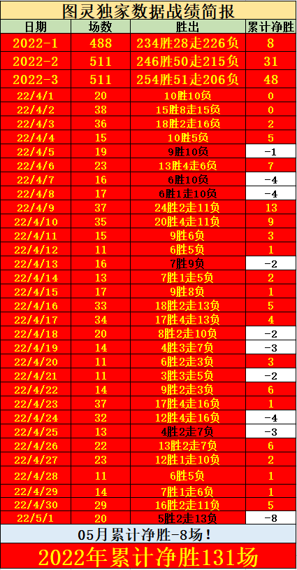 昨天数据表现不佳,早场的5场有1场顺利打出,晚场的6场有3场顺利打出,夜场的9场有4场顺利打出!昨天数据中,早场的日职进球数表现较差,3场全部被灭,是早场失利的重要原因!晚场的表现还不错,其中俄超和意甲的表现最佳,2场都顺利打出对应的高概率方向。夜场的表现一般,其中西甲和意甲的表现最好,2场都是顺利打出对应的高概率方向,表现给力!而哥斯甲3场只有1场顺利打出,哥伦甲更是全灭,这些都是夜场失利的重要关键所在。昨天整体的表现是失败的,也导致五月第一天就开始逆风开局了,不过没事,所谓逆风的方向更适合飞翔,笔者依然有信心在本月能够继续追赶四月的成绩甚至超越,毕竟数据的模型已经非常完善了!