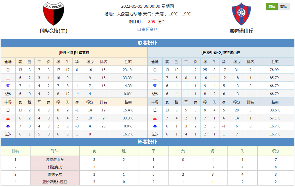 北京时间2022年5月5日06:00,自由杯分组赛G组的一场比赛,由阿甲球队科隆竞技坐镇主场迎战巴拉甲球队波特诺山丘,科隆竞技过去2场杯赛均不胜,本场能否借主场之利重回胜轨?波特诺山丘过去2轮杯赛均在主场斩获胜仗,本场作客又能否延续胜绩?