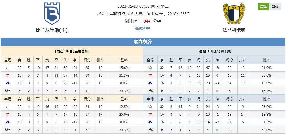 北京时间2022年5月10日03:15,葡超第11轮较量,比兰尼塞斯主场对战法马利卡奥,比兰尼塞斯过去5次面对法马利卡奥未曾有过胜绩,毫无优势可言,那么此番较量,比兰尼塞斯是否还有悬念?我们拭目以待。