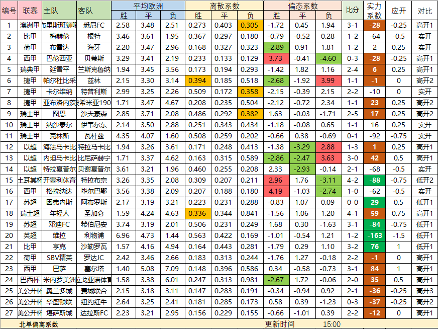 偏离系数使用说明:偏离系数由偏态系数和离散系数组合而成,简称偏离系数,离散系数是测度数据离散程度的相对统计量,主要是用于比较不同样本数据的离散程度。离散系数大,说明数据的离散程度也大;离散系数小,说明数据的离散程度也小。通常我们认为离散系数大说明各家单位对该项赛果的分歧大,不容打出,一般来说离散系数最小的两项打出概率较高。但离散系数只是描述分歧的相对大和小,比如胜平负三项离散系数都很高,说明三项分歧都较大,我们不能盲目排除分歧最高的一项。另外,离散系数也只是描述了分歧大和小,有时候分歧大,可能看好的单位更多,所以我们又引入了偏态系数,偏态系数为正,代表各家单位整体更看好该项赛果,数值越高,代表看好程度越高,我们把-2.4——2.4定义为小偏态,低于-2.4和高于2.4定义为大偏态,一般来说正值大偏态代表单位更加看好该选项。这两个系数需要综合参考,比如让球方离散系数低,同时偏态系数高,则打出概率大;如果让球方离散系数高,同时让球方偏态系数低,受让方偏态系数高,则出冷概率增加。最后提醒大家,由于偏离系数根据欧洲数据计算而来,所以当欧洲数据变动较大会造成偏离系数变动较大,也请大家留意临场欧洲数据变动情况。此外,当离散系数高于1,偏态系数绝对值大于15,往往属于数据异常,不易盲目参考。后期我们会随着数据的积累陆续发布使用教程。