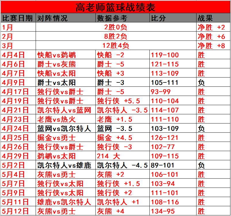 高老师上一场给出的参考是灰熊受让4分,结果灰熊主场轻松大胜勇士。高老师分析的几个点到位:首先缺少莫兰特的灰熊依然强劲,防守更强,其次,灰熊最近几场比赛的开局打得十分好,本场比赛继续开局取得先机,最重要的是布朗执教的勇士对比科尔执教的勇士不是一个级别。本场比赛高老师继续取胜,高老师季后赛取得12胜2负的战绩,今天继续出发,给大家带来独行侠和太阳的比赛,信心场次不容错过。