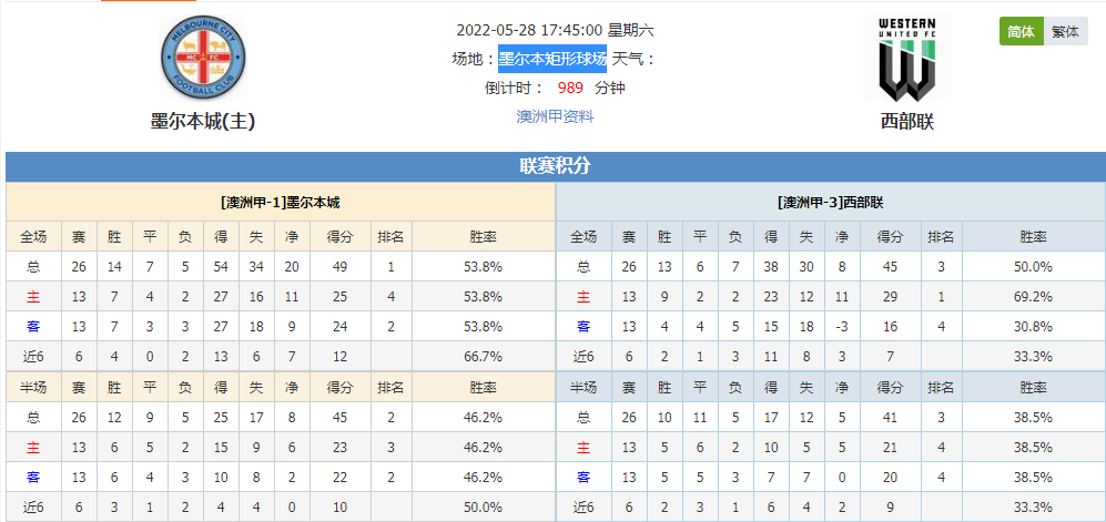 墨尔本城本赛季澳洲甲成绩14胜7平5负,积分49,排名第1;西部联本赛季澳洲甲成绩13胜6平7负,积分45,排名第3