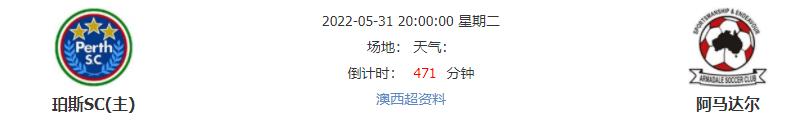 北京时间2022年05月31日20:00,澳西超的一场焦点比赛,由珀斯SC坐镇主场迎战阿马达尔,双方本赛季的表现不想上下,近期的状态也是半斤八两,那么本场胜利究竟花落谁家?我们拭目以待。