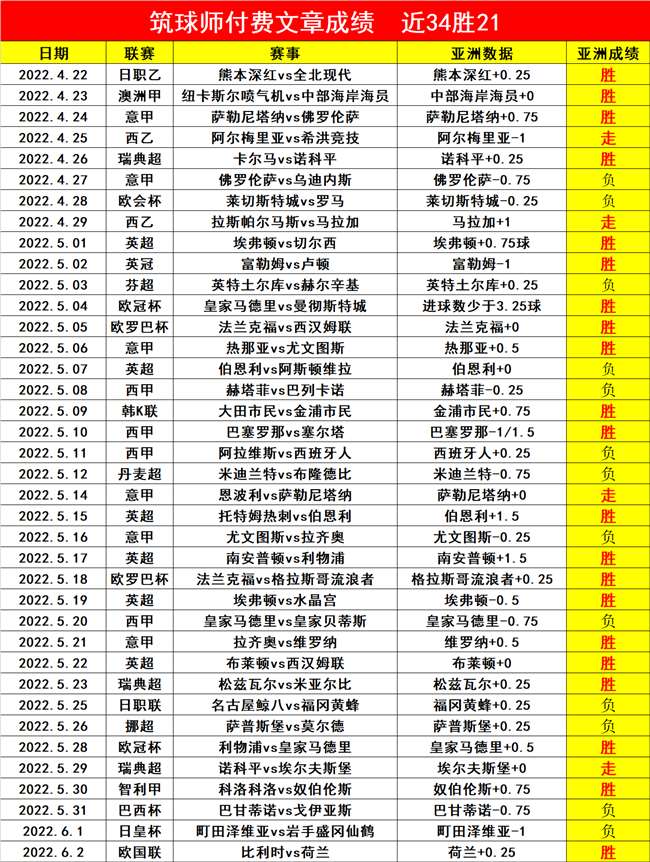 筑球师前天休息一天,专门针对性的对欧国联的比赛进行剖析,回顾前天的比赛结果,对比数据走势的方向,最终精选细出一场比赛:比利时vs荷兰,送出客队方面,结果毫无悬念地以一场4-1的大比分拿下;亚洲数据取得近34胜21;今天笔者留意到一场日职乙的比赛,这场比赛其实在前天就有所留意,其中有很多地方会误导大家,筑球师在这里帮助大家理清思路,防止踩坑;希望能通过筑球师的努力在接下来的日子里能与大家分享更多更好的赛事,有望各位多多支持!